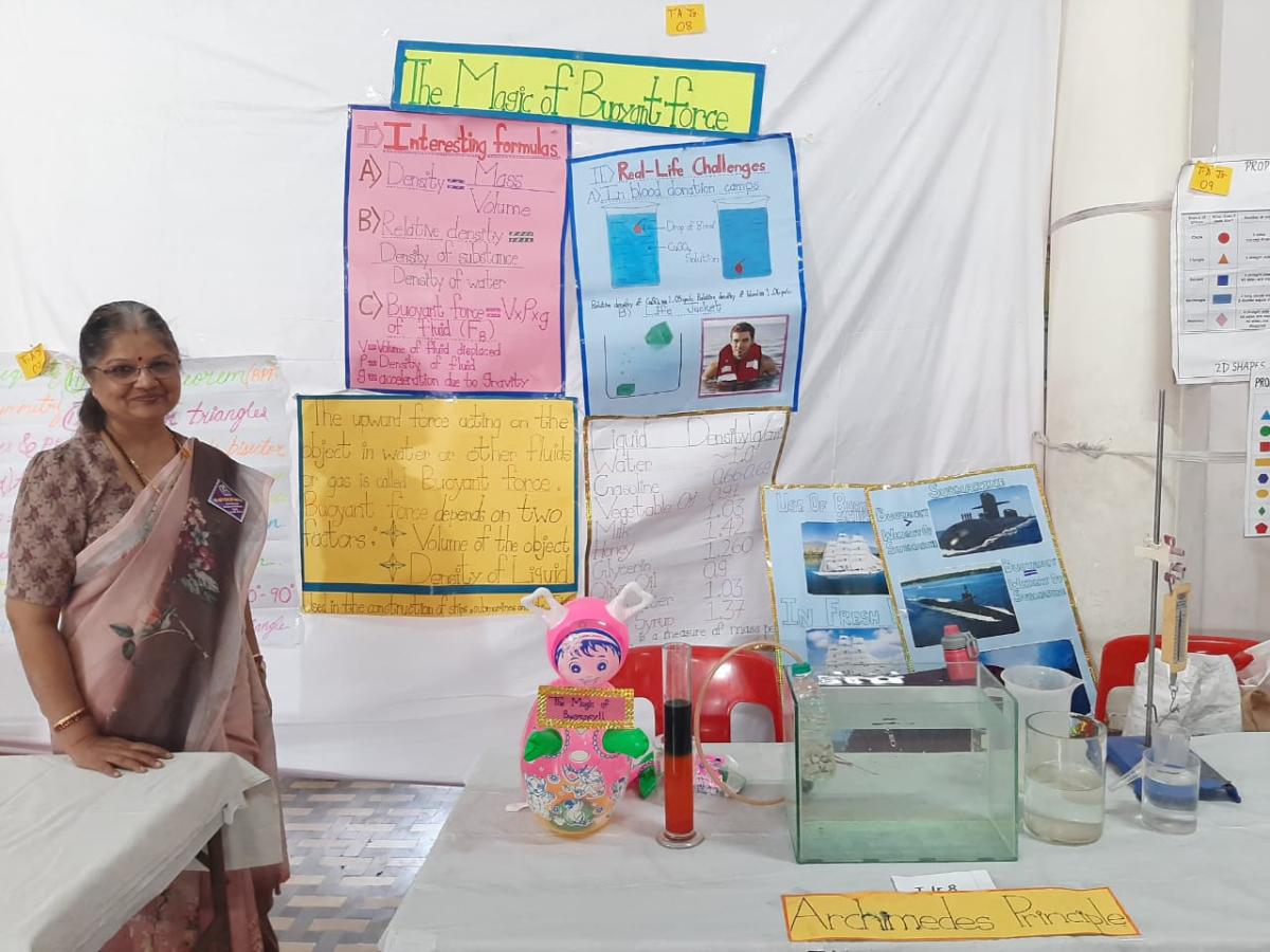 Mrs. Savita Nagananda participated in the Science Exhibition (Teaching Aid) conducted at the Ward Level on November 27 and 28 at Sitaram Prakash High School, Wadala and subsequently at the Mumbai District Level on December 15 and 16 at BJPC High School, Charni Road with her innovative project titled “The Magic of Buoyant Force”. The teaching aid was developed with the objective of making scientific concepts experiential, engaging and easily understandable for students. The project focused on the applications of Archimedes’ Principle and the concept of buoyant force. Mrs. Savita Nagananda designed and presented working models and prototypes that demonstrated real-life applications such as Submarines, determining the weight of an elephant, ships floating in marine water etc. The models were interactive in nature and aimed at arousing curiosity, creativity, and scientific thinking among students through hands-on learning.